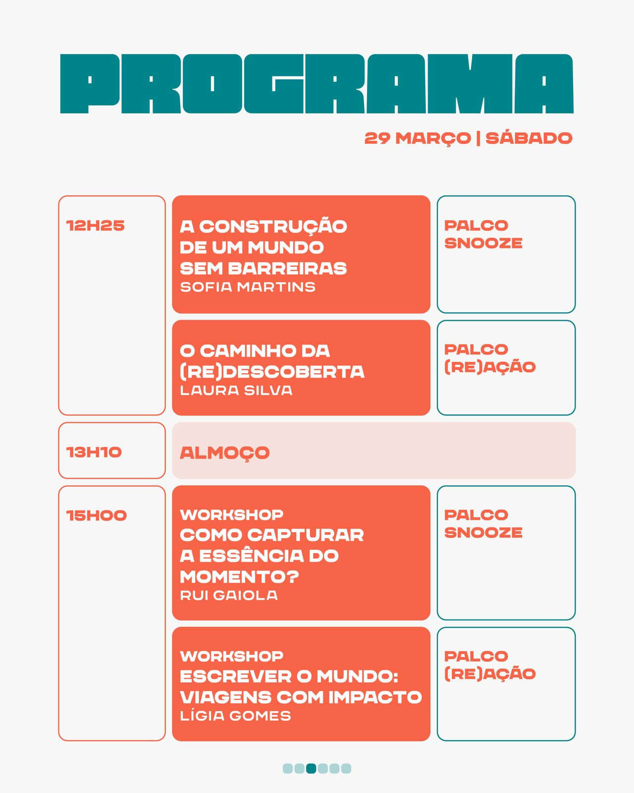 A sua participação será um workshop de escrita em viagem, onde irá partilhar truques e dicas práticas para quem deseja começar a escrever sobre as suas experiências. O objetivo é mostrar como traduz em palavras as vivências e emoções das suas viagens, além de refletir sobre o percurso enquanto viajante e blogger.